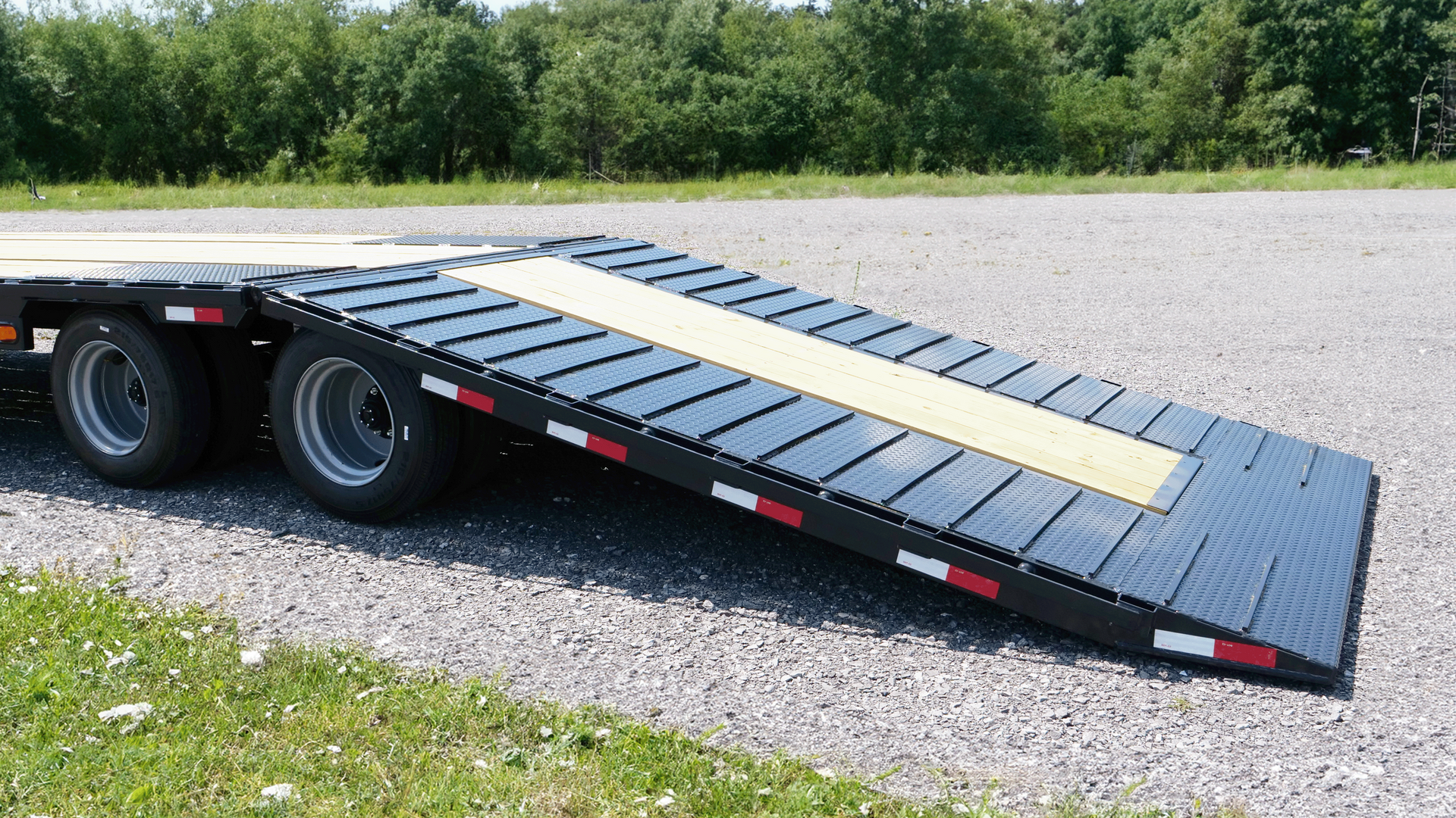 The 12” I-Beam frame and 3” channel cross-members provide superior strength and durability, while the treated pine floor and double hinged 5’ mega ramps or hydraulic dovetail make loading and unloading a breeze. The trailer also features stake pockets along both sides, 5’ cleated dovetail or 12’ hydraulic dovetail, and (4) 5/8” D-rings for secure tie-down options.