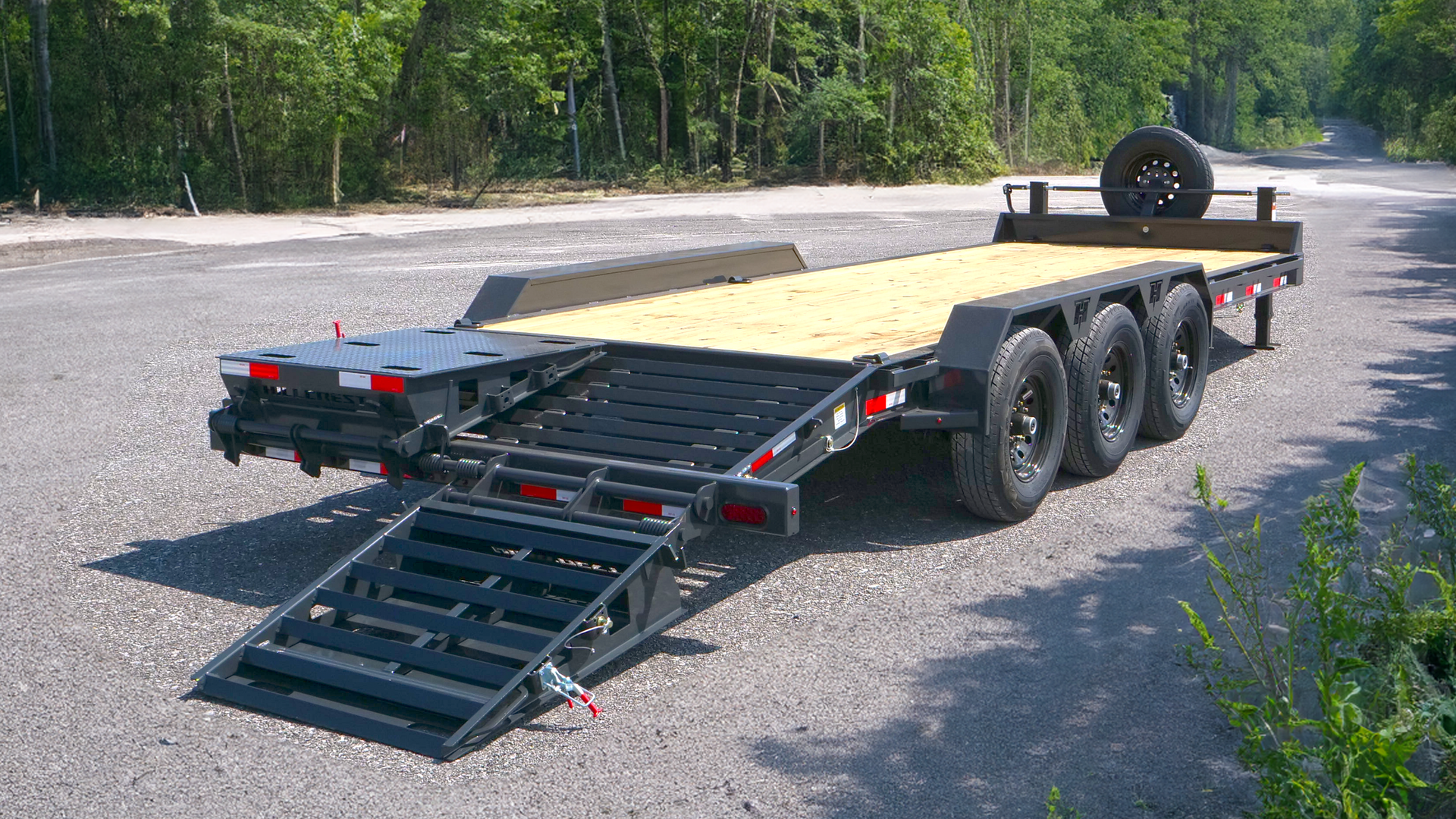 Constructed with a sturdy 8” I-Beam frame and 13LB tongue, this trailer is designed to last. The multi-leaf spring suspension with equalizer, along with the 3” factory channel cross-members, provide a stable and smooth ride. The 3’ cleated dovetail and double hinged 3’ mega ramps make loading and unloading equipment a breeze.